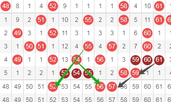 上图是福彩快乐8开奖号码走势分布图其中一部分,我标注出来的数字52 56看绿色小箭头表示的都是斜连号码,标注出来的数字57看黑色小箭头表示的是跨度二的斜连号码。这里三个数字52 56 57。