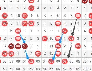 上图是福彩快乐8开奖号码走势分布图其中一部分,我标注出来的数字62 65看蓝色小箭头表示的都是隔一期的斜连号码,标注出来的数字67看黑色小箭头表示跨度二的斜连号码,这里三个数字62 65 67。