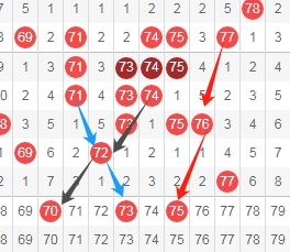 上图是福彩快乐8开奖号码走势分布图其中一部分,我标注出来的数字70看黑色小箭头表示的都是跨度二斜连号码,标注出来的数字73看蓝色小箭头表示隔一期的斜连号码,标注出来的数字75看红色箭头表示隔两期的斜连号码,这里三个数字70 73 75。
