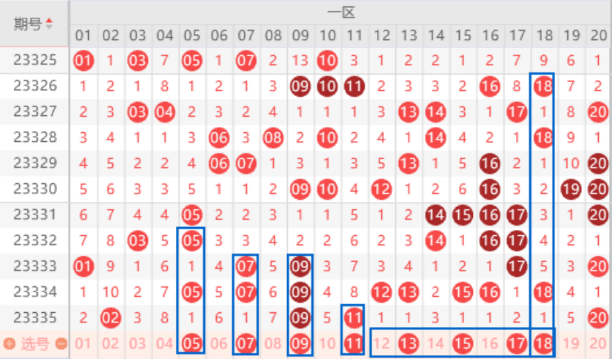该区间的05 07 09号数字上期开出了09号数字的三重号码,本期我们注意一下09号数字走4重号的情况。本期的05 07号数字我们也是要注意回补情况。本期的11号数字我们也是要注意走重的情况。上期的12 13 15 16 18号数字一个号码都没有出重,本期我们就要注意回补的情况了,本期重点关注一下13 15 17 18号数字回补的情况就行了。