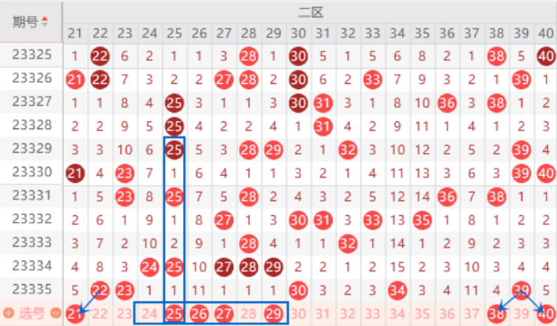 本期的21号数字我们注意一下出号情况,本期的不看好20 22 23出重,那么这里的21号数字我们就要注意了。上期的24 25 27 28 29号数字也是没能出重号,本期我们要走注意一下回补情况,重点考虑一下25 27 29号数字的回补情况就行了,25号数字是属于121走势。27号数字是属于空一对称号码,29号数字是属于复制号码,都有出号机会的。上期开出了39号数字,本期我们注意一下出现分边的情况,所以本期的38 40号数字我们是要注意的。