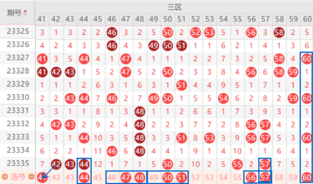 本期的41号数字是属于遗漏7期的号码,本期遗漏7期的号码有4个,应该是要出一个的,我们要注意一下。上期开出了42 43 44号数字的三连号,本期我们注意一下出重的情况,重点关注一下43 44出重的情况。本期的46 47 48号数字也是有机会出一个号码的,我们重点关注一下47 48号数字的出号情况就行了。上期开出了50号数字,本期我们要注意一下49 50或者50 51同出的情况。上期开出了55 57号数字,本期我们要注意一下出一个重号的情况,夹号56号数字我们也是要注意一下的。