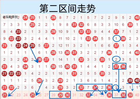 连号21 22我们要注意一下出重号的情况,重号29本期我们要注意一下出3重号的情况,它的邻号28 30的出号情况我们也是要关注的。32 34 36是属于3连空一出号类型,这种类型我们一般就选一个夹号和重号就可以了,重点关注33 36号的出号情况。连号37 38的落号情况我们也是要重点考虑的。