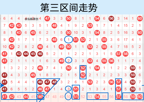重号41和重号46已经形成了门。那么堵门的42 43 44 45本期我们就要注意了,应该能有几个号码出来的。46号数字是倒三角,本期我们要注意注意一下。中心对称53 54 55在回补了53之后断号了,那么本期的54 55我们就要注意回补一个的情况了。59号已经出了4重号了,那么本期58 60号我们就要注意了,出一个号码的机会是非常大的。