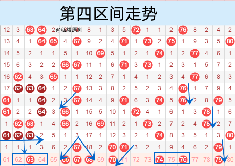 三连号61 62 63上期没能落重号下来,那么本期我们就要注意回补的情况了。上期开出了67号,是属于冷号的邻号,本期我们要注意一下继续出重号的情况。四斜连号71 72 73 74上期落下了头部74号,那么本期我们就要注意尾部号码74的出号情况了。76号是属于空四对称,本期我们也是需要注意的。