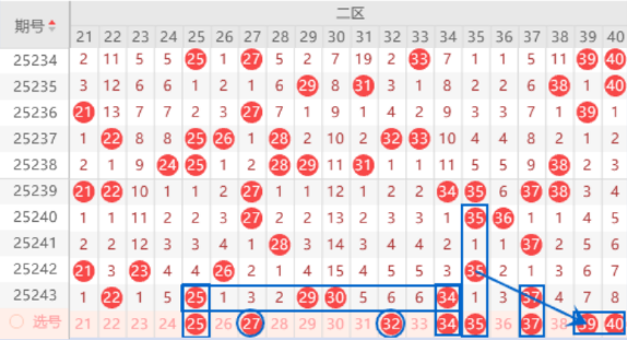 该区间上期开出了22 25 29 30 34 37号数字,本期我们注意一下出重号的情况,其中的25 37号数字可以重点关注一下出号情况。本期的21 22 23号数字是有很大的断号风险,本期我们可以直接放弃了。本期的25 32号数字是属于空三中心号码,本期是有机会出一个号码的,本期可以防守一下27 33号数字或者28 32号数字同出的情况。本期的39 40号数字我们注意一下出号情况,其中的39号数字可以重点关注一下出号情况。