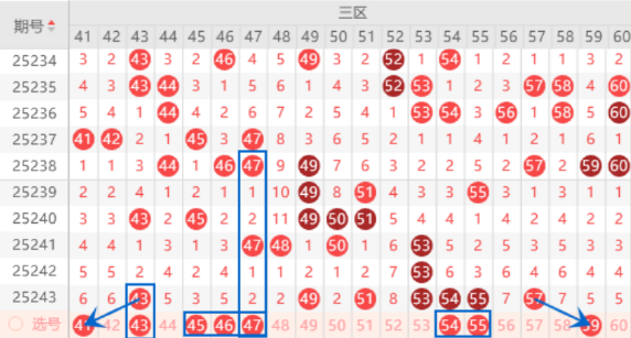 该区间的41 42号数字我们注意落下一个号码的情况,其中的41号数字可以重点关注一下。本期的44 46号数字是属于交叉对称回补号码,本期是有机会出一个号码的,可以重点关注一下。上期开出了53 54 55号数字的三连号,本期我们注意一下出重号的情况,其中的54 55号数字可以重点关注一下出号情况。本期的59 60号数字我们注意落下一个号码的情况,属于连号落号情况,其中的59号数字可以重点关注一下。