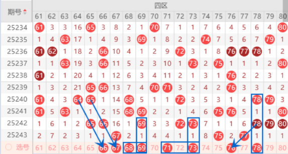 该区间的66 67号数字是属于连号斜连号码,出一个号码的机会是有的,我们可以重点关注一下。本期的67号数字我们防守一下出重号的情况,毕竟上期开出了57 67 77号数字,本期出一个重号的机会是比较大的。本期的71号数字我们也是有机会出号的,本期可以防守一下68 71号数字同出的情况。本期的76号数字是属于三斜连号码,出号机会也是有的,我们可以关注一下。三连号78 79 80号数字上期没能开出重号来,本期我们注意一下落下一个号码的情况,其中的78号数字可以重点关注一下。