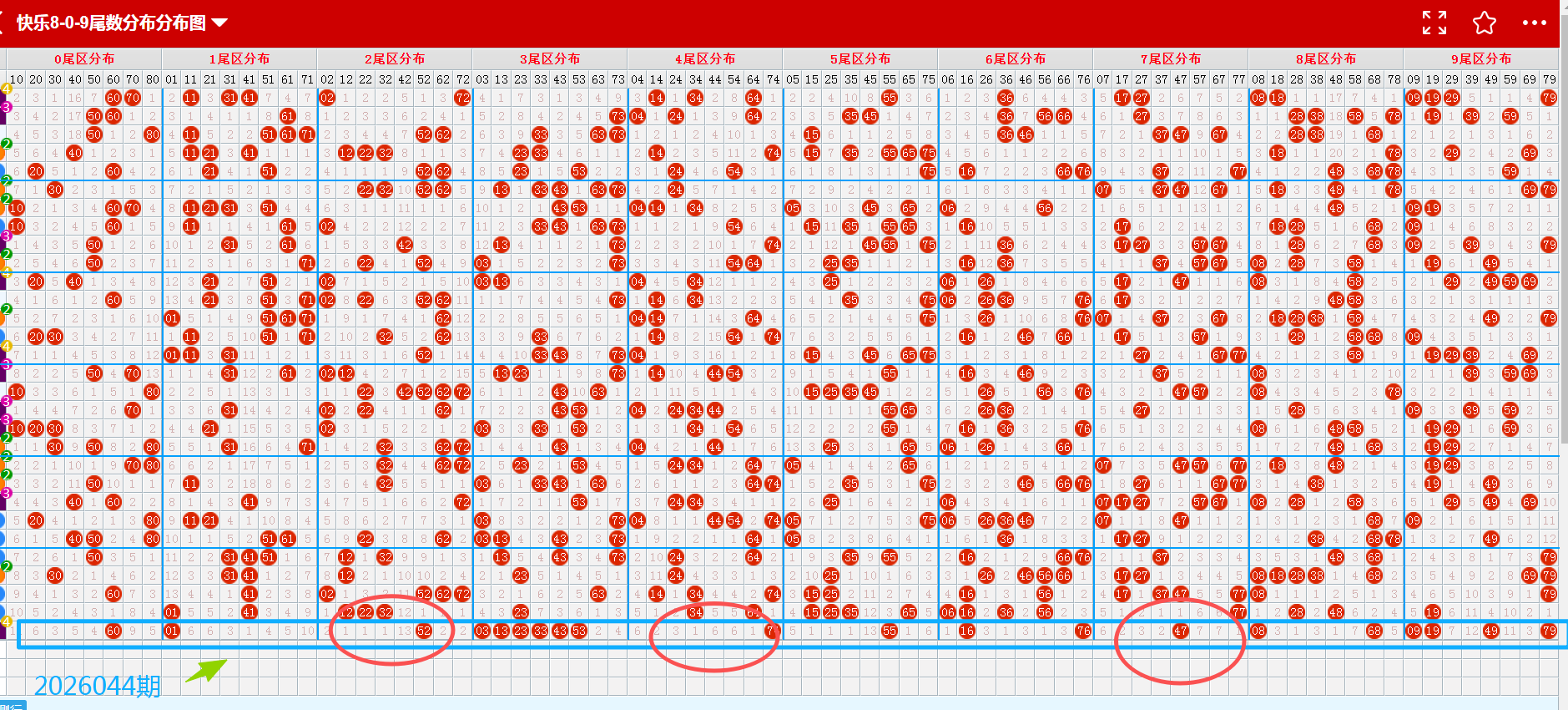 上图是快乐八2026044期的尾码走势图,从图中看0尾到9尾出号个数依次是:0尾号码区开出1个;1尾号码区开出1个;2尾号码区开出1个;3尾号码区开出6个;4尾号码区开出1个;5尾号码区开出1个;6尾号码区开出2个;7尾号码区开出1个;8尾号码区开出2个;9尾号码区开出4个;再看小尾号码(0尾-4尾)区有10码,大尾号码(5尾-9尾)有10码;数据比对统计后可以看到本期3尾出号数量最多,一共开出了6个中奖号码。本期没有出现断区!由走势比对推断2026045期重点需要关注2、4、7尾区号码下号热度回补和落号数量增加的概率较大。