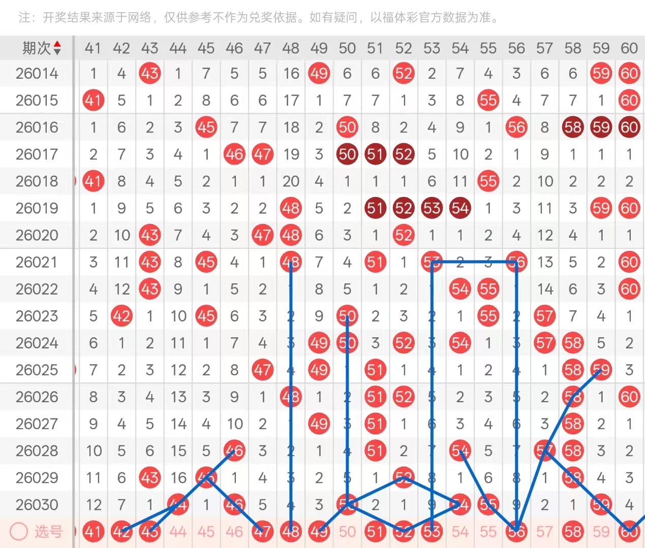 三区:三区间上期开出了六码,4字头头部位置开出了16期遗漏下落的44,以及空一回补的46。尾部位置开出了空五下落的50,以孤码形态开出。5字头头部位置开出了空一回补的54,以及六期遗漏下落的55,以对子形态开出,尾部位置上面开出了六重58的分边号码,四期遗漏回补的59。本期四字头头头部位置可重点防守,44,46两码的一码做重,其次交叉形态4345两码在本期可做二选一下落,且43与47在本期也同为斜连号码可二选一开出,尾部位置上面关注49,51两码为50的孤码分边,防守50的做重且与49-51以对子形态开出,头部位置上面上期3739开出可考虑404142三码有一码的下落。5字头头部位置上面可重点关注52的菱形空一回补,其次分边号码5153在本期做二选一,上期5455以对子形态开出,本期分边号码53,56做二选一,尾部位置上面57-58-59三码防守一码开出即可,以及60的四期遗漏回补,也需要关注下落。
