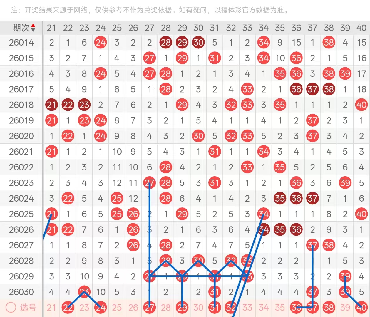 二区:二区间上期开出了四码,2字头头部位置开出了十期遗漏下落的23,以孤码形态开出,尾部位置一码没有开出,处于放空状态,3字头头部位置则开出了五期遗漏下落的31做重,其次尾部位置上面开出了空二回补的37,以及39的五期遗漏做重两码同时开出,中部位置处于放空状态。本期2字的头部位置可关注21,22两码的四期遗漏回补,其次23以孤码的分边开出,关注分边号码22,24两码的二选一下落,中部位置上面二五,二六在本期防守下落即可,其次27,29,31在本期与属于空一回补可关注1~2码的下落,上期梅花没有开出的28,30,32在本期可考虑一码空二回补,三字头头部位置关注31的双重分边,其次做成也需要重点考虑中部位置34-35-36三码连号控四回补,考虑一码下落即可,可优先关注36的四期遗漏回补,为37孤码的分边,上期37-39同时开出,本期可防守3字头处于放空状态,仅需要考虑头部位置31-32-33三码的下落即可,以及尾部位置上面40的五期遗漏也需要防守。