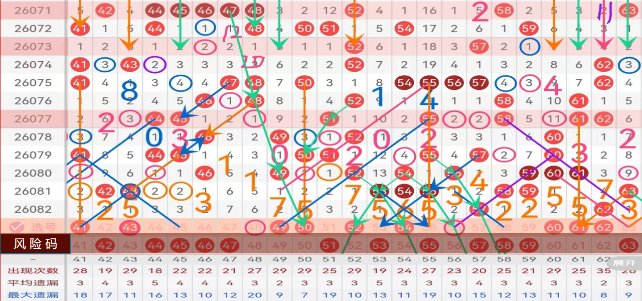 三区间上期出了1个号码,冷态开出;端部41,高数据多线斜连码,41 45交叉斜连,二择一推荐41主防;42 43隔期下面推荐43主防;区间中部的49 50可连号防守,49小数据,第八次走遗漏7,50顺势走势码,第六次走遗漏3点位,可根据组合需要拿号,这里的49 52可做同遗漏连号防守,52顺势码,高数据码,可带上54的顺势码做偶数连带小连的形态49 50 52 54;尾部一码69做防;42 44 45 46 47 51 53 55 57 58 59风险码;