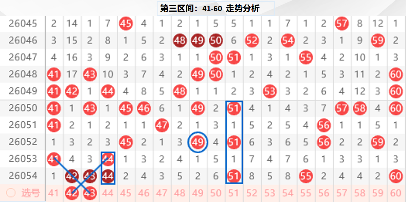 三区分析:【41-60】(走势图标注号码非小黄车大底,请谨慎参考,具体思路将在直播间分享讨论)