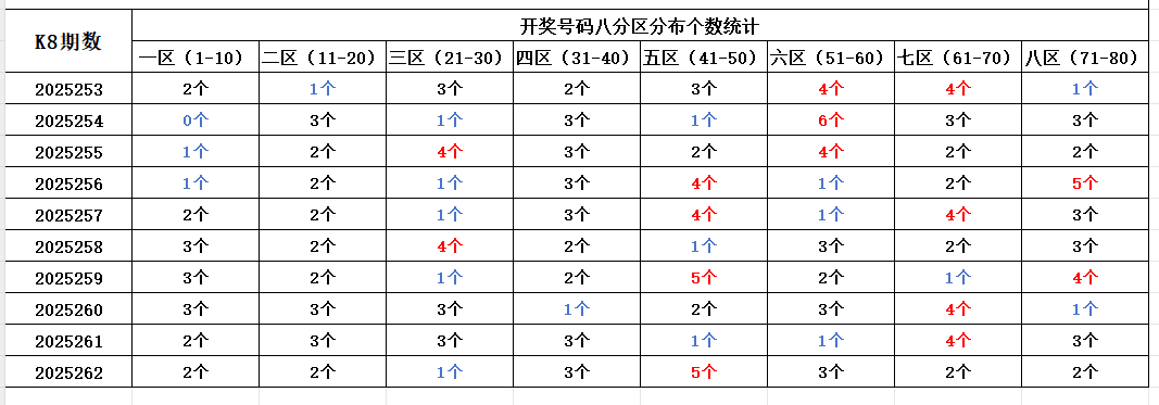 首先看上期回顾,“快乐8”第25262期开奖结果:8.10.14.19.27.31.33.40.42.44.46.47.49.54.58.60.67.70.75.77;通过分析开奖号码,分享第一个数据分析:统计开奖号码的八分区冷热走势,判断出号规律。以近10期开奖号码的八分区统计数据为例: