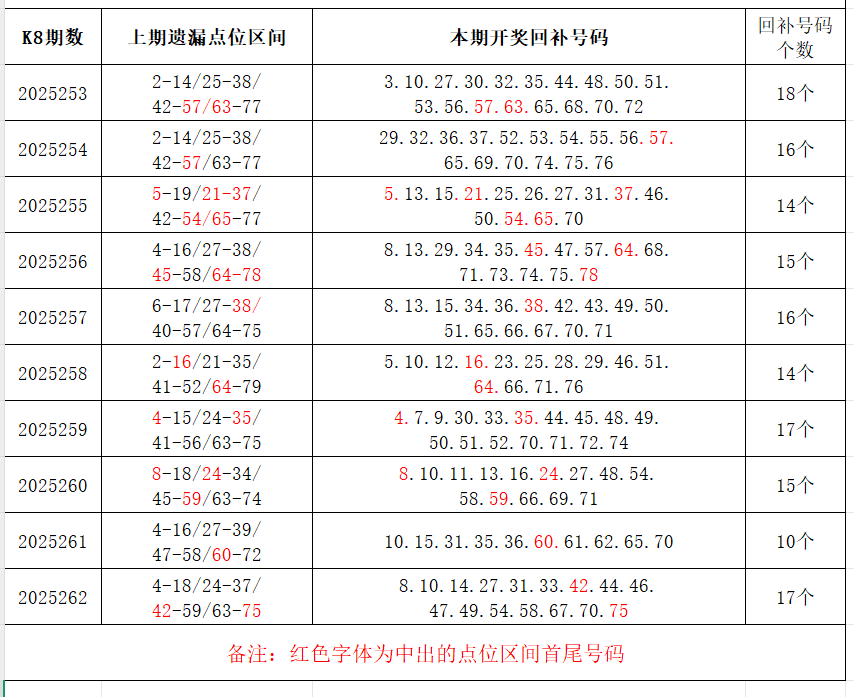 如图,上期的遗漏号码在下期开出10个左右,即为回补号码。定准点位区间首尾号码是关键!以上期2025262期为例,定位4个遗漏区间,围中17码!结合上期开奖号码,以跨度值大于或等于7为依据,本期关注4个遗漏区间:1-8/19-27/33-40/60-67;重点关注遗漏区间:7-18/27-39/43-59/63-76,区间遗漏号码可能在本期回补开出。注意区分遗漏区间回补号码和大底号码,不要混淆。个人分析,仅供参考。