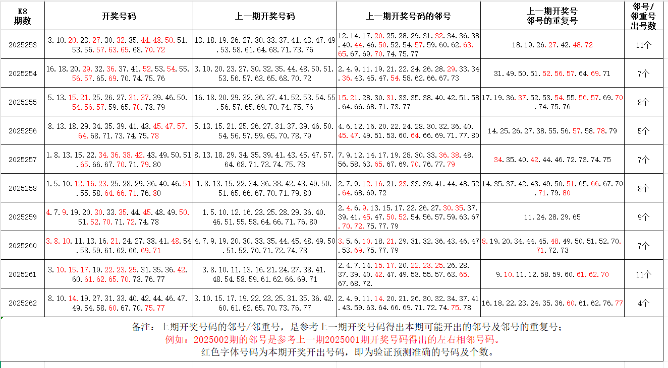 如图,红色字体是上期邻号、邻重号在下期开出,每期开出10个左右。上期邻号开出2个,邻重号开出2个。本期参考邻号:7.11.13.15.18.20.26.28.30.34.39.50.53.55.57.61.66.68.69.71.74.78;邻重号:9.32.41.43.45.46.47.48.59.76;个人分析,仅供参考。
