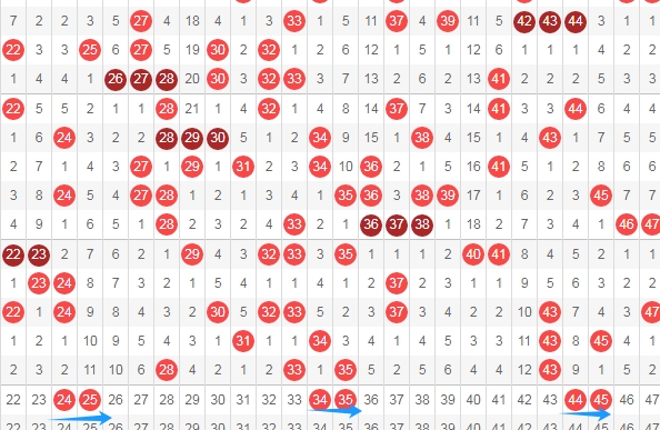 上图是福彩快乐8开奖号码走势图中的其中一部分走势图,我在上面标注出来的数字都是4尾数和5尾数组成的连号组合,这些连号组合有2425 3435 4445足足有3组,到今天这些连号组合足足连续十几期没出现,那么本期个人观点就是看这些连号组合出一组或者两组,个人看好4445 2425。
