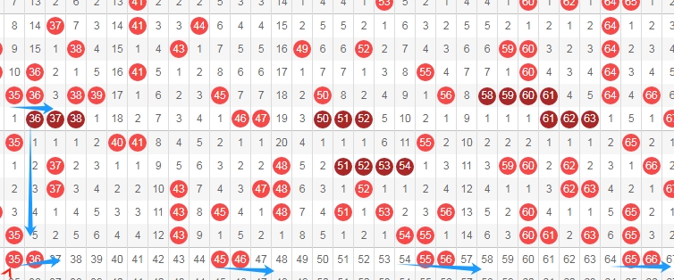 上图是福彩快乐8开奖号码走势图中的其中一部分走势图,我在上面标注出来的数字都是8尾数和9尾数组成的连号组合,这些连号组合3536 4546 5556 6566足足有4组,到今天这些连号组合足足连续6期没出现,那么本期个人观点就是看这些连号组合出一组或者两组,个人看好4546 5556。