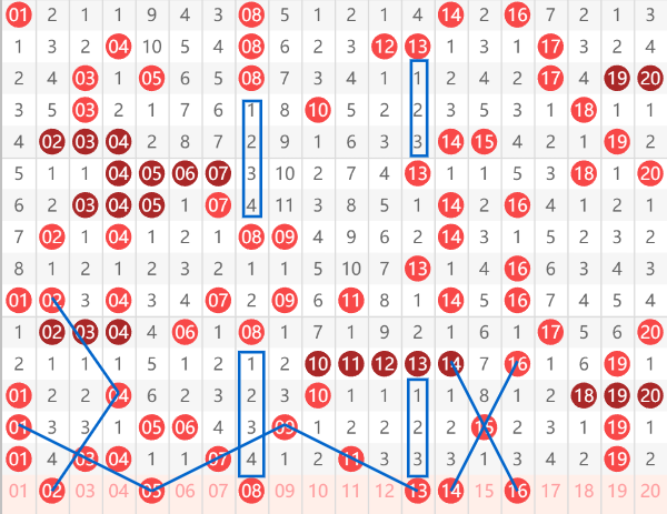快乐8第071期01-20区域,推荐的第一个号码是02号,大家可以看到04向上间隔一给03,然后带02,那么04向下同样是间隔一给03带02,而且旁边有三个01,这个02开出的概率很大,然后就是05,看到01间隔一给03.04,然后再给个05的走势。同时09间隔一给07,间隔一再给05的走势下来,就是08上下对称的走势。间隔4,中间间隔2,下面间隔4,然后就是十三号间隔对称走势可以看到中间两个间隔2,上面是间隔3,下面也是间隔3,下列就是16和14这两个交叉斜连的号码。这个推荐大家二选一。