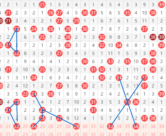 快乐8第071期20~40区域,推荐的第一个号码22,大家看到上面是22,间隔1给21,斜着开22,下面是刚好相反,22给21,然后间隔一给22,24这个号码,大家看到24间隔一给两个25,他很可能拐回来给个24。然后就是29这个号码大12期的遗漏,目前有一个25隔一开27,再间隔一给29的走势,下面就是33这个走势,看到37间隔两期给35,再间隔两期给33的走势,然后就是36号的走势。从34间隔两期给35,再间隔两期给36,同时36和37之间又有一个经典的三脚夹角走势。