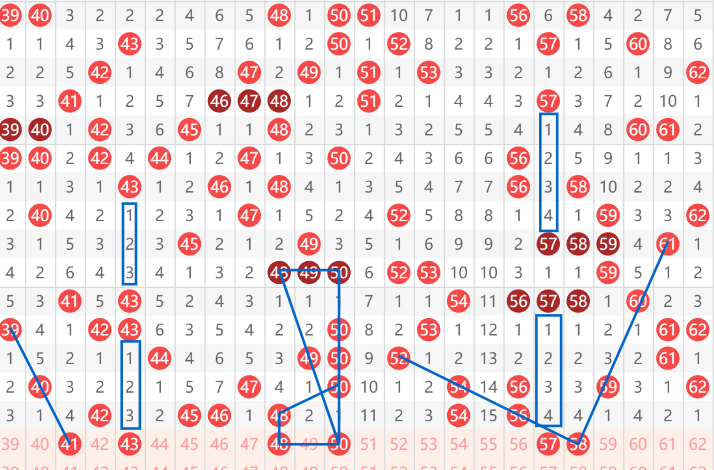 快乐8第071期41-60区域:推荐的第一个号码是41号,可以看到39,间隔一给40,再间隔一给41的一个,间隔一斜连同时看42向上给出了41,那么向下有可能开出41,结合着旁边43的间隔3对称,这个41.43有望同时开出过来。就是48和50这个号码,这两个号码很有可能同时开出,50是一个倒三角,48又是一个正三角。然后就是57这个号码间隔4,间隔一,然后再间隔4的一个对称。然后就是58,大家看到61给60,间隔2给59,再间隔一给58的一个走势,同时从52斜过来的58。