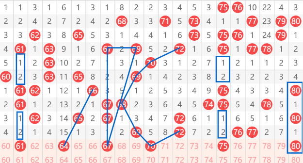快乐8第2026070期61-80区域:推荐的第一个号码61号,可以看到上下间隔对称的间隔二走势,然后就是64号具备一个65、66的间隔一走势,而67号我们可以看到是一个大的三角形走势。再往后就是70号,可以看68向上间隔一给69,然后代数70向下是同样的走势,同时看到72在近期开出之后,下一期多数会带出70。再往后就是75这个上下间隔2的对称走势,然后是80的间隔一走势。