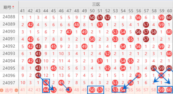 上期该区间的两个冷号44 46号数字都开出来了,本期我们注意出一个重号的情况。本期的45号数字我们注意一下出号情况,属于三斜连号码,出号机会也是很大的。本期的47号数字是属于遗漏7期的号码,本期遗漏7期的号码有4个,还是有机会出一个号码,其中的47号数字走势是较好的,可以关注一下。本期的51号数字我们重点关注一下,这里可以防守一下50 51号数字同出的情况。上期开出了53 55号数字,本期我们注意出一个重号的情况,夹号54号数字我们也是要注意出号情况的。