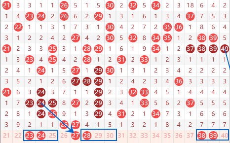 本期的23 24号数字我们要注意一下,同出的情况还是有的,但是我们重点做一个号码就行了。本期的28号数字我们要注意一下,毕竟上期开出了27号数字,那么本期的28号数字很有可能被带出来的。本期的我们要防守一下38 39 40号数字的出号情况,重点关注一下38 39的出号情况就可以了。
