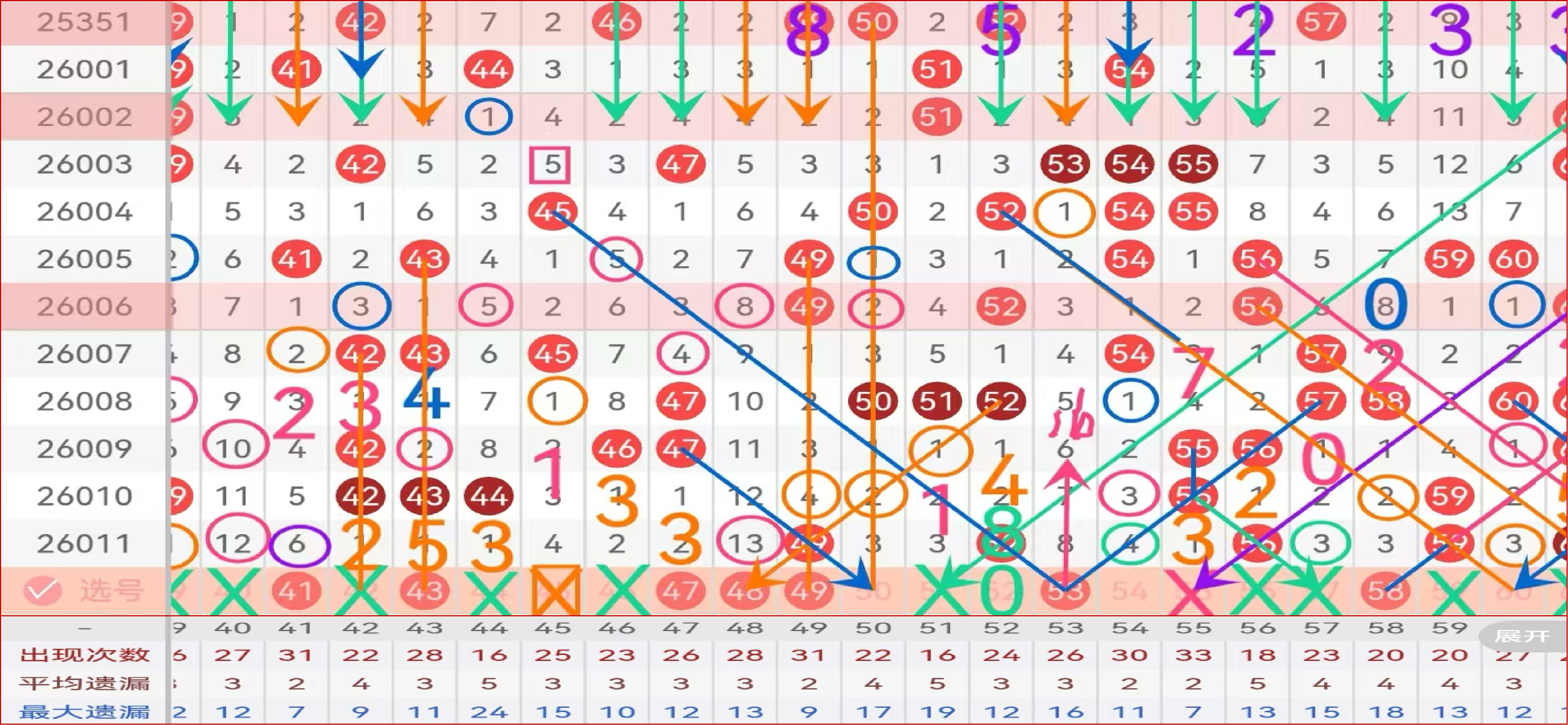 区间推荐主做号码41 43 47 48 49 53 58  防守号码50 54 60;