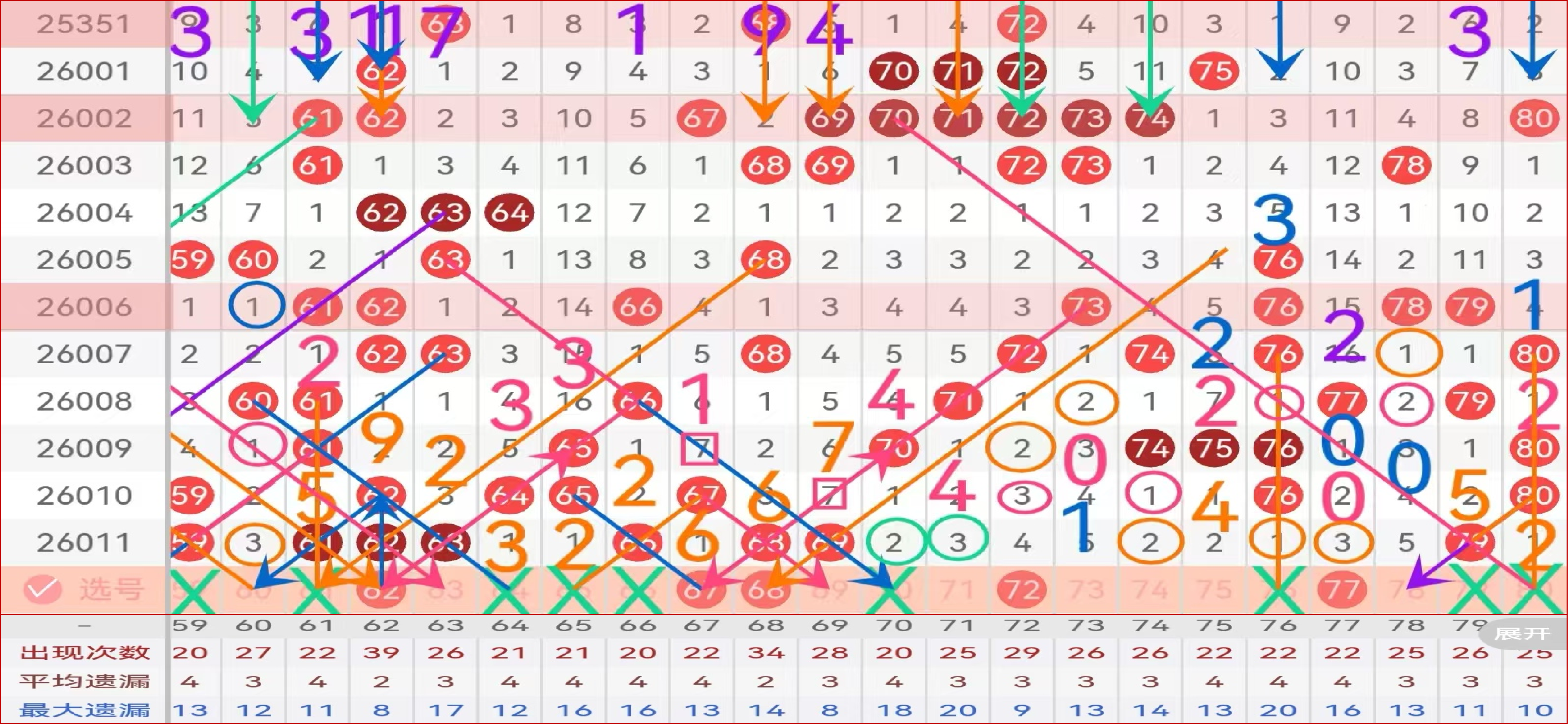 四区间给到主做号码球62 67 68 72 73 77 防守号码63 74 75 78;