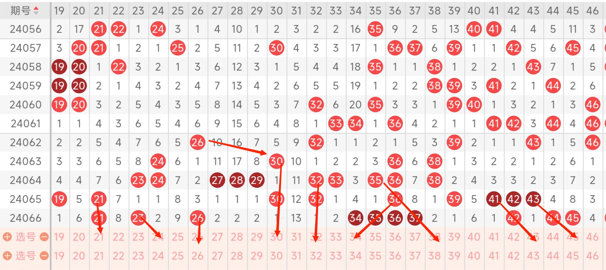 区间分析:24065期开出五个号码球和24066期开出六个号码球,三区的号码球有42号球是二连出走势和号码球53号球的二连出走势,本期注意号码球42号球的三连出走势和号码球45号球的二连出走势,斜开奖走势号码球注意号码球43号球的开出和号码球45号球的开出走势和预防号码球54号球的遗漏二期开出走势!