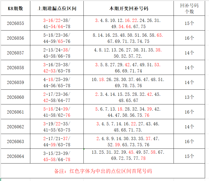 如图,上期的遗漏号码在下期开出10个左右,即为回补号码。定准点位区间首尾号码是关键!以上期2026064期为例,定位4个遗漏区间,围中15码!结合上期开奖号码,以跨度值大于或等于7为依据,本期关注3个遗漏区间:1-13/38-45/49-57;重点关注遗漏区间:2-14/22-38/44-56/60-76。点位区间号码和大底号码请勿混淆,个人分析,仅供参考。