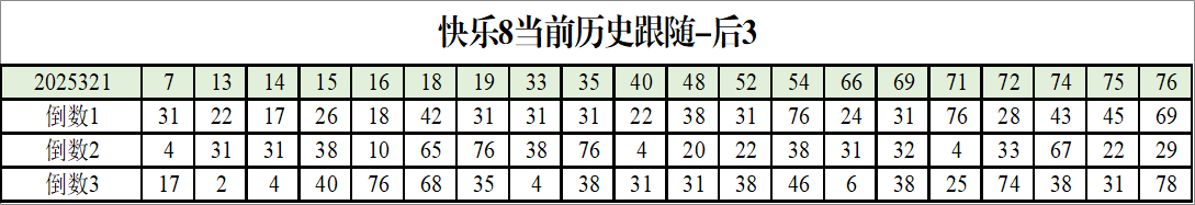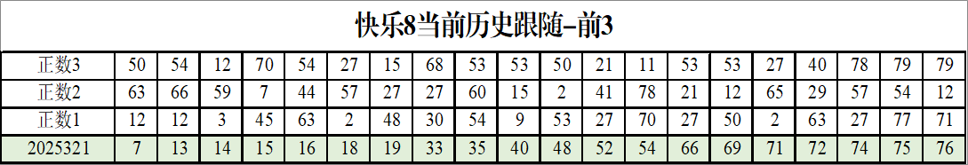 我感觉选热的同时,还要注意防冷条件开出,可以直接选取每个号码跟随出次前三的号码,也可以考虑把出次最后的三个数字加进去,不过这样可能号码太多,可以尝试。图上也能看出单独号码跟随的情况,我就不一一统计每个号码的出次了,我这里考虑提高概率,取每个号码历史跟随的前三号码和后三号码,根据2025321期的号码,我关注正数3和倒数3的号码号码为: