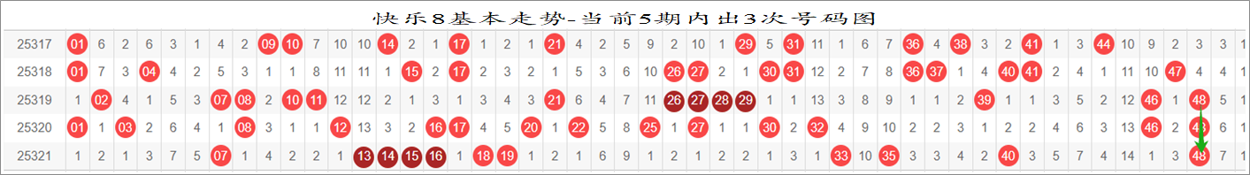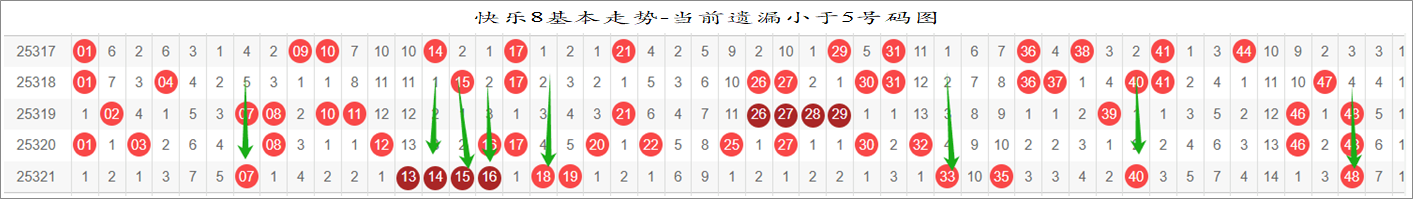 所以这个条件值得关注,从号码分布图上我们可以分析出,遗漏小于5期的号码有: