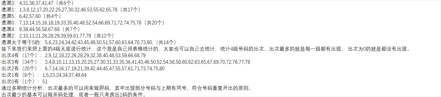 从上图看出,还是值得我们参考,经过统计精选了这些号码作为精选大底(1,7,8,10,14,15,16,17,21,26,27,29,30,40,46,48,52,53,54,55,62,66,74,75,78,79,),共26个,上期这个条件有26个,开出5个,所以可以用来作为我们进一步组号的一个条件。