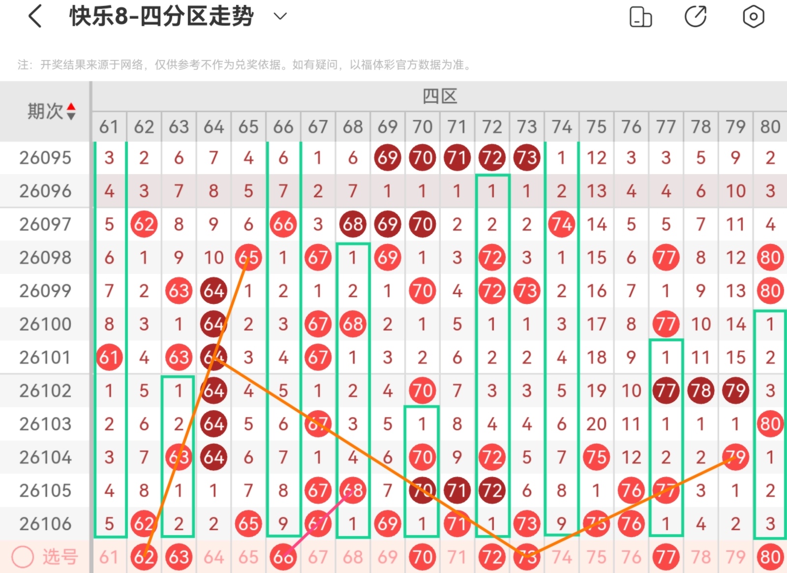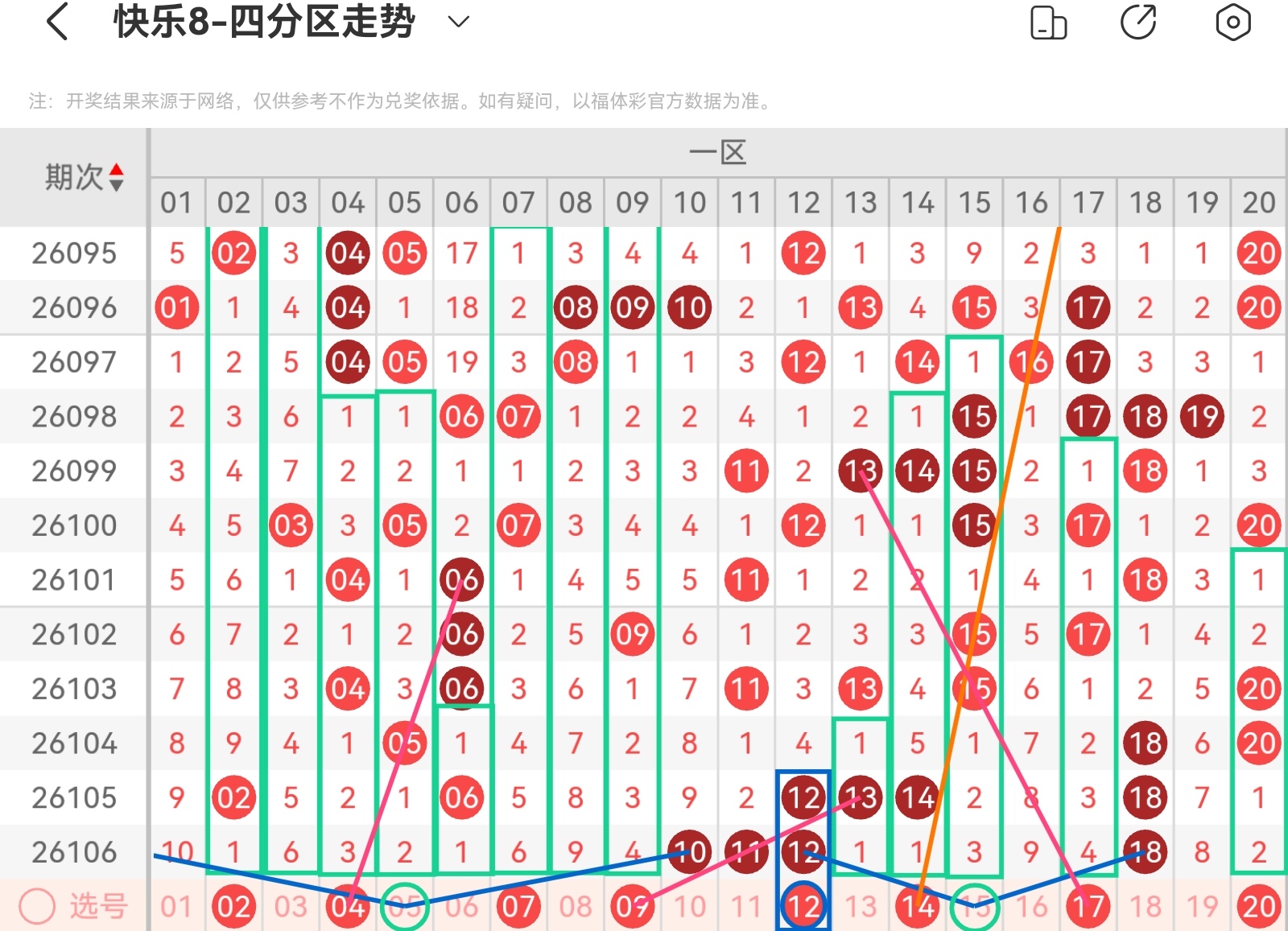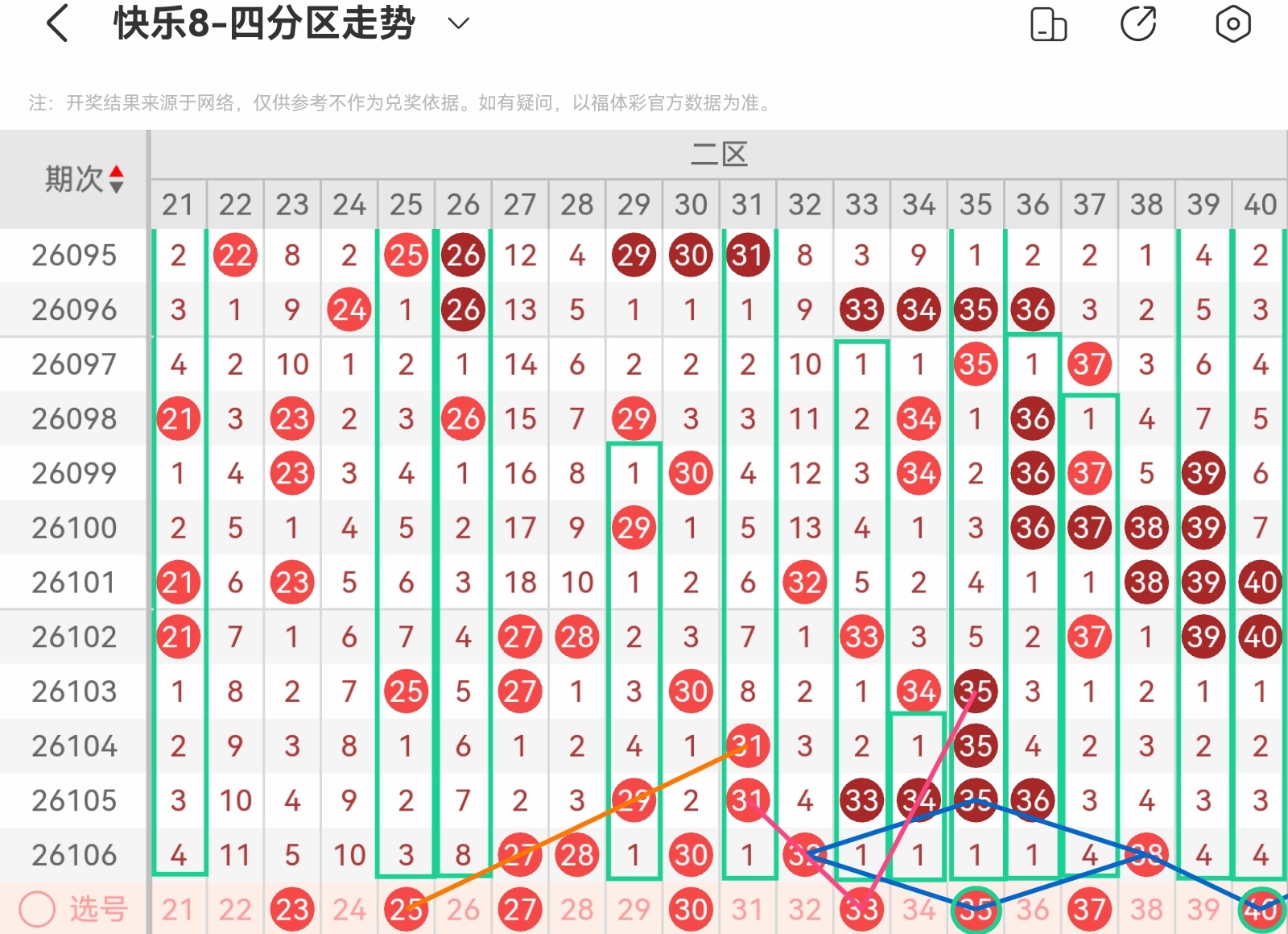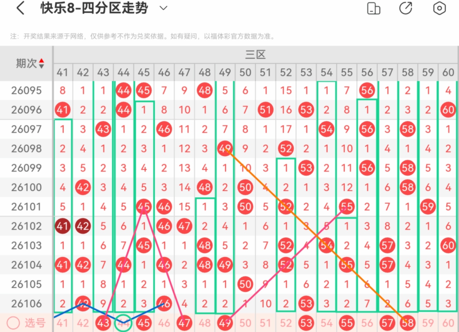 大家好,我是甜丝丝的坏事,主要以快乐八的形态走势、空位走势、遗漏走势以及斜连走势相结合的方法,用公认的四分区走势来进行预测分析,希望能让你有所收获。