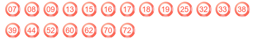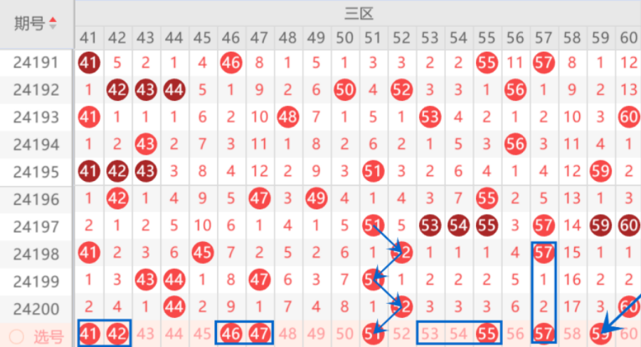 本期的41 42号数字我们注意一下出一个号码的情况,其中的41号数字可以重点关注一下。本期的46号数字我们注意一下出号情况,它是遗漏9的号码,本期有3个,出一个的机会很大。连号53 54 55号数字我们注意一下落号情况,其中的55号数字我们注意一下出号情况。本期的57号数字我们注意一下出号情况,属于重号回补号码。本期的69号数字我们注意一下出号码情况,属于三斜连号码。