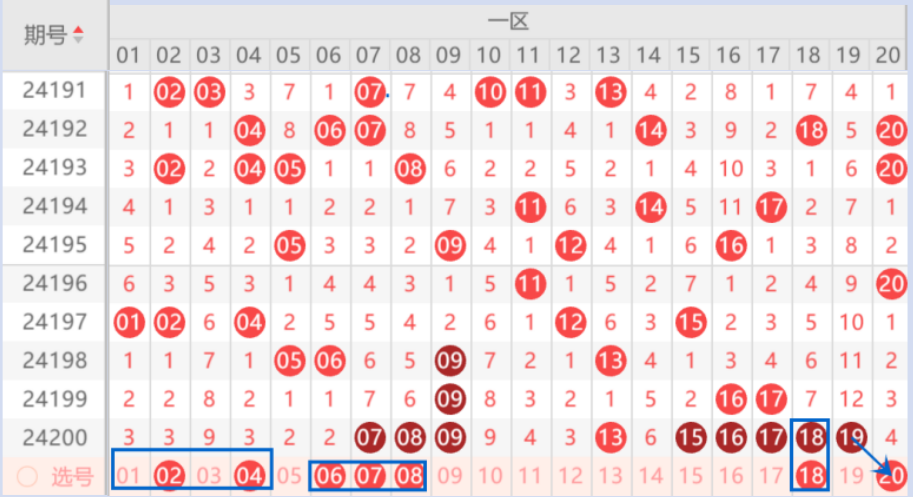 本期的01 02 04号数字我们注意出号情况,属于连号空一带号回补号码,本期是有机会出2个号码的,重点关注一下02 04号数字的出号情况。上期开出了三连号07 08 09号数字,本期我们注意一下出重号的情况,重点关注一下07号数字走重的情况。上期开出了五连号15 16 17 18 19号数字,本期我们注意一下出重的情况,重点关注一下18号数字出重的情况。本期的20号数字我们关注一下出号情况。