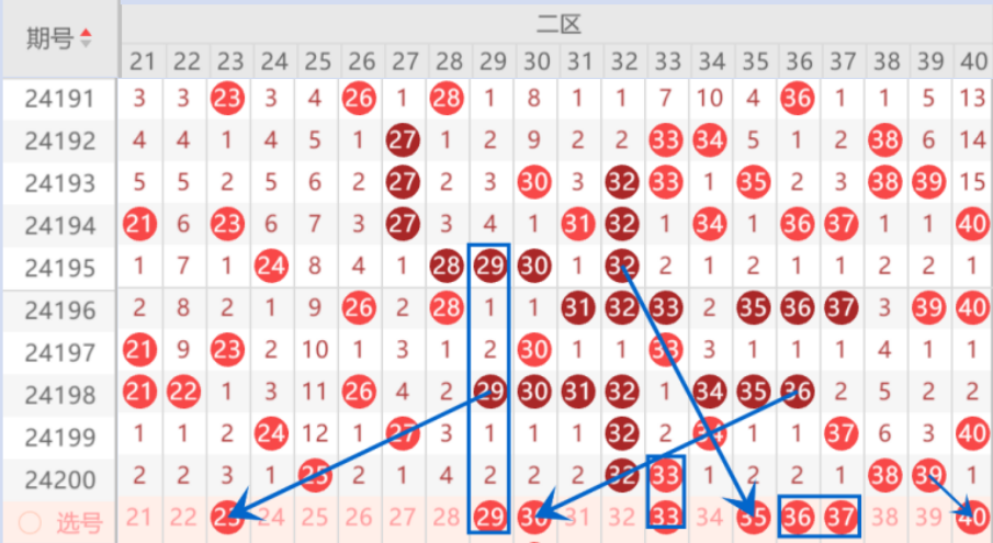 本期的21 23号数字我们注意一下出号情况,本期是有机会出一个号码的。本期的29 30号数字我们注意一下出号情况,属于三连号回补号码,出号机会很大。本期的33号数字我们防守一下出号情况,本期是有机会出号的。本期的35 36 37号数字我们注意出2个号码的情况,其中的35 37号数字可以重点关注一下。本期的40号数字我们注意一下出号情况。