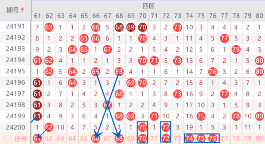 本期的61号数字我们注意一下出号情况,最好做一下防守就行了。本期的66 68号数字我们注意一下出号情况,本期出一个号码的机会是很大的。上期开出了70 71号数字,本期我们注意一下出一个重号的情况,重点关注一下72号数字的出号情况就行了。本期的74号数字我们注意一下出号情况,本期出号机会是有的。本期的76号数字我们也是要关注一下出号情况。