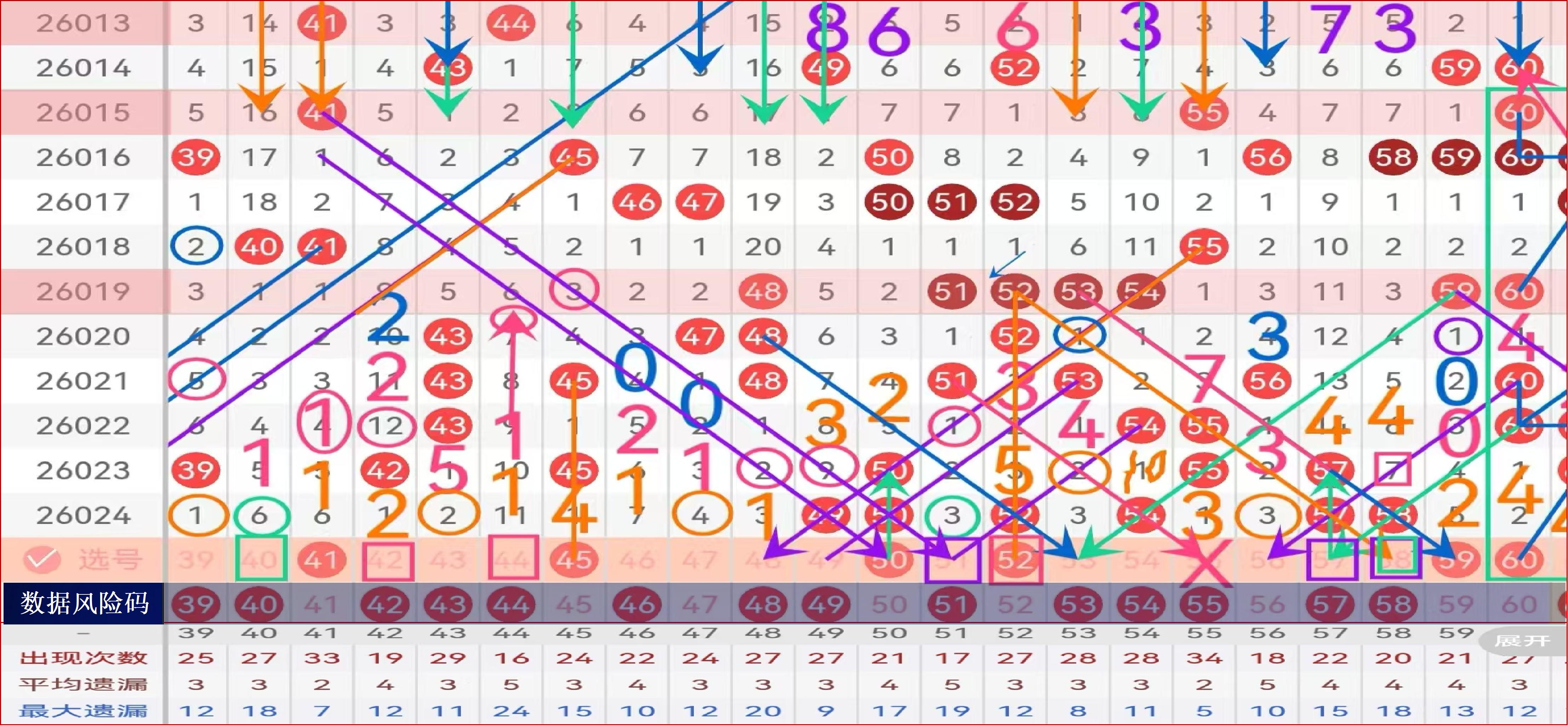 区间推荐主做号码41 45 50 52 59 60 防守号码47 56;