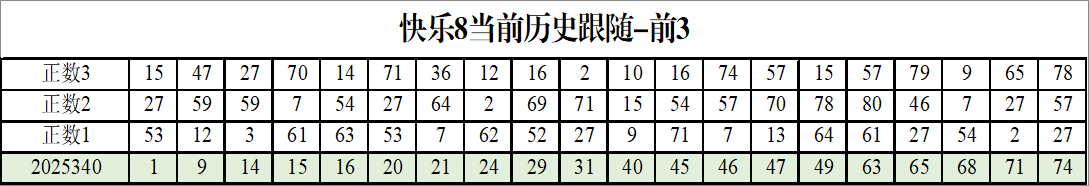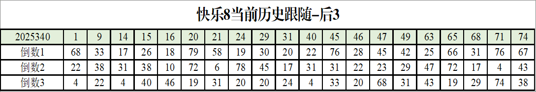 我感觉选热的同时,还要注意防冷条件开出,可以直接选取每个号码跟随出次前三的号码,也可以考虑把出次最后的三个数字加进去,不过这样可能号码太多,可以尝试。图上也能看出单独号码跟随的情况,我就不一一统计每个号码的出次了,我这里考虑提高概率,取每个号码历史跟随的前三号码和后三号码,根据2025340期的号码,我关注正数3和倒数3的号码号码为: