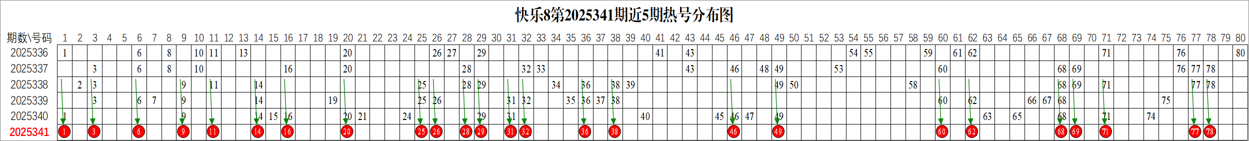 尾数分析其实是简化号码的做法,把80个号码用10个尾数来分析,通过多期来看,尾数变化灵活多样,我的思路是把上期尾数出次进行统计,分析出次多少情况,一般情况下,最热的尾数,下一期基本不会持续热下去,上期最冷的尾数,下一期也不会持续冷下去,所以我选取上期尾数排序中间的6个尾数作为本期看好的尾数,那么6个尾数包含了60个号码,相比较也是大概率开出号码的条件。
