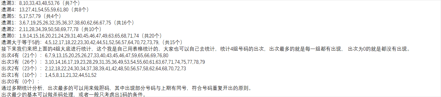 我的基本思路是通过号码尾数情况,取出6尾相关的号码作为第一组大底,然后统计号码跟随的情况分析出第二组大底,通过短期遗漏分析形成第三组大底,再按照对数补数分析统计出第四组大底(根据情况可能实时增加其他大底 ),最后把这些大底进行统计,重点关注出次最多的号码,搭配出次少的号码,灵活组号,形成本期精选胆码。
