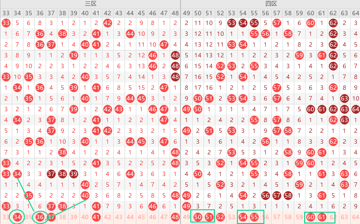 三区看好1尾,4尾6尾,形态上36是三斜连,最看好上图已勾画,三区最近重号趋势隔一期出一期,那么本期大概率有重号看好37 41二出一,边号没断,本期看34 36 37 38 39 40 42 46 47出2码,看好34 36 ,那么本期关注四码34 36 37 41