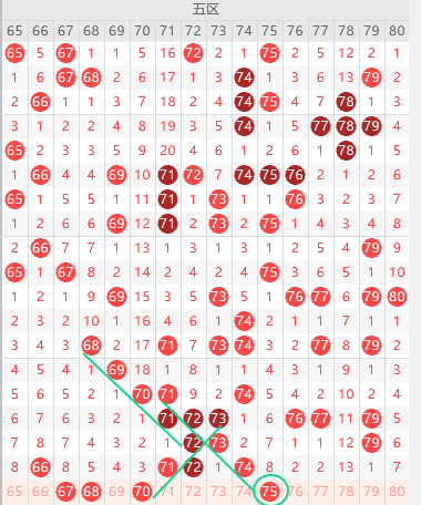 五区看好5尾7尾,上期连号重号没断那么本期重号只有66 71 72 74,四出一,71概率最大,边号看65 67 70 71 72 73 75要出号,形态上70 71 75最好看上图已勾画,5尾看好65 75二出一,连号不断看好67 68,结论是关注五码65 67 68 71 75