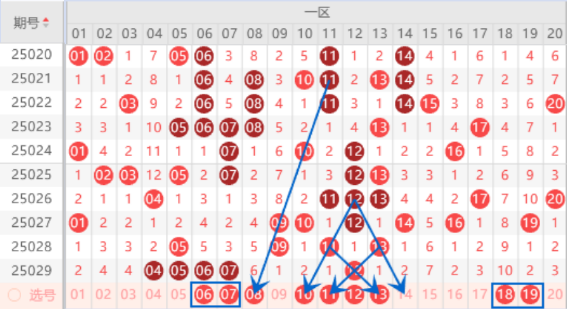 上期开出了04 05 06 07号数字的四连号,本期我们要注意出重的情况,其中的06 07号数字我们重点关注一下出重的情况。本期的08号数字是属于四斜连号码,出号机会也是有的,我们可以关注一下出号情况。本期的11 13号数字是属于交叉对称号码,本期是有机会出一个号码,我们可以重点关注一下出号情况。本期也是要防守一下12号数字出重号的情况。本期的18 19号数字我们注意出一个号码的情况,其中的19号数字可以重点关注一下。