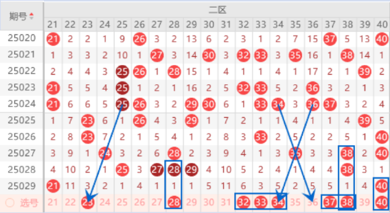 本期的23 33 43号数字是属于尾数上的连号落号,已经遗漏3期没有出号了,本期出一个号码的机会是很大的,其中的33号数字我们可以重点关注一下。上期的连号空一带号25 27 28 29号数字没能开出重号,本期我们要注意落下号码的情况,其中的28 29号数字我们可以重点关注一下出号情况。本期的34 36号数字是属于交叉对称号码,本期是有机会出一个号码的,我们可以重点关注一下。本期的38号数字我们注意一下出号情况,这里我们可以防守一下37 38号数字同出或者38 40号数字同出的情况。