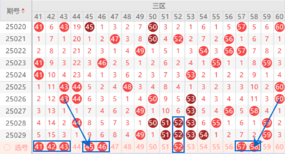 本期的41 42 43号数字我们注意一下出2个号码的情况,这里我们防守一下41 43号数字或者42 43号数字同出的情况。本期的45 46号数字大概率也是要出一个号码的,我们可以关注一下46号数字的出号情况。上期开出了51 52 53 54号数字的四连号,本期我们要注意出现三重号的情况,其中的52号数字我们可以重点关注一下出号情况。本期的57 58号数字我们防守一下同出的情况。