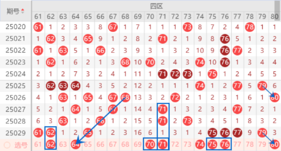上期开出了61 62号数字的连号,本期我们注意一下出一个重号的情况,其中的62号数字我们可以重点关注一下出号情况。本期的64号数字是属于斜五连号,本期可以做一下防守。本期的71 73号数字我们注意一下出一个号码的情况,这里可以防守70 71号数字或者73 74号数字同出的情况。上期开出了75 76 77 79号数字,本期我们注意出一个重号的情况,其中的75 76号数字我们可以重点关注一下出重号的情况。由于上期开出了79号数字,本期的80号数字我们也是要注意一下出号情况。